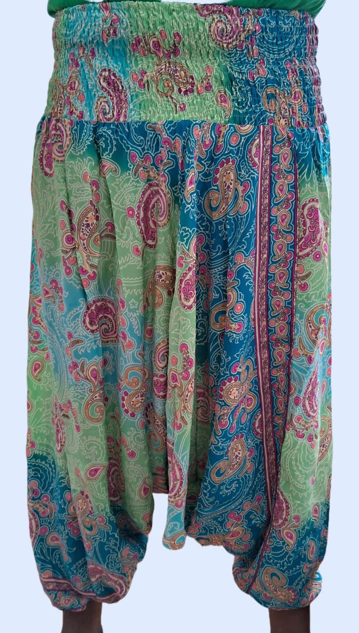 Calça indiana saruel de seda, tamanho único, com elástico na cintura e na barra, extremamente leve, elegante e confortável. Estampada e modelo unissex.