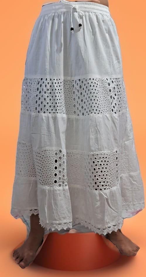 Saia longa branca em algodão com cordão e elástico, tamanho único.